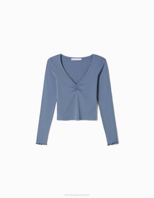ユニセックス Bershka ギャザーVネックの長袖Tシャツ 60443838 衣類 青