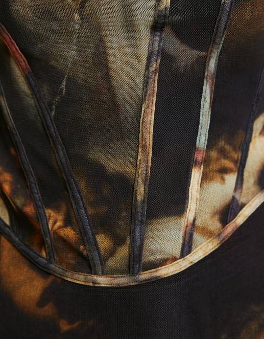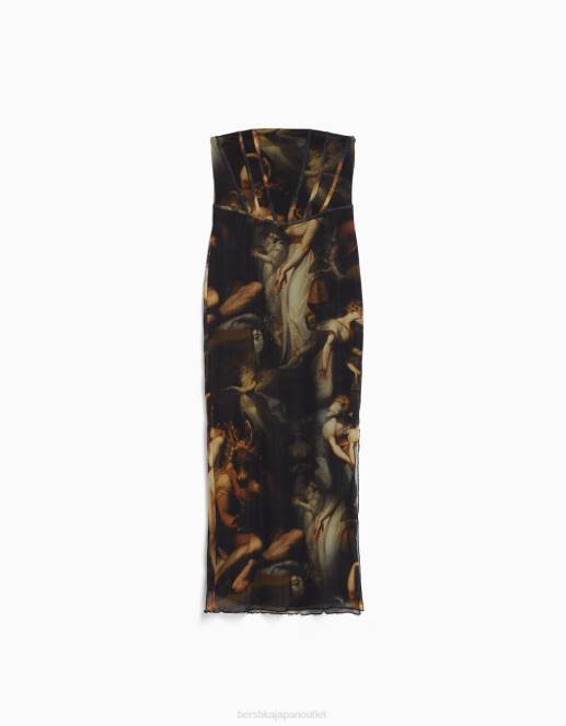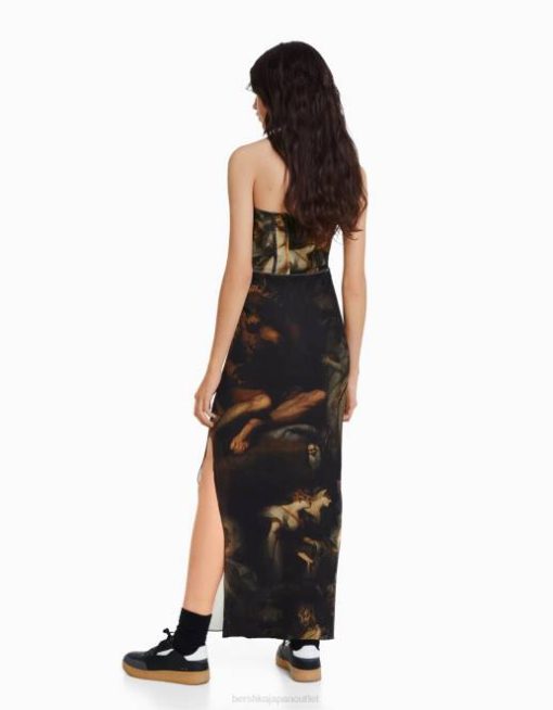 女性 Bershka アートシリーズ プリント ミディチュールドレス 6044262 衣類 黒