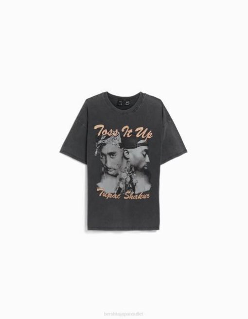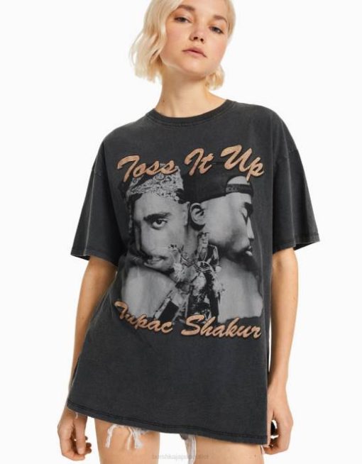 女性 Bershka トゥパック プリント 半袖 T シャツ 6044338 衣類 グレー