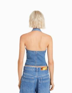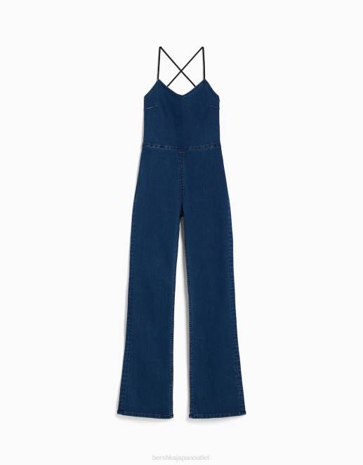 女性 Bershka バックにカットアウトを施した伸縮性のあるデニムジャンプスーツ 604461 衣類 ライトブルー