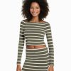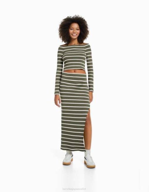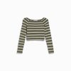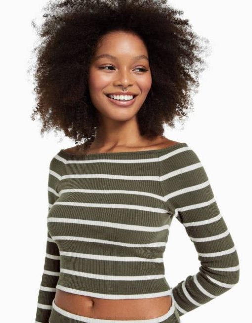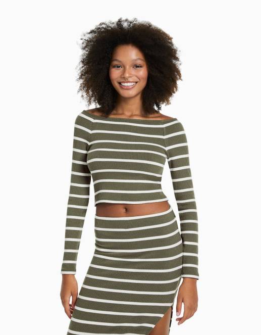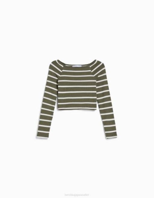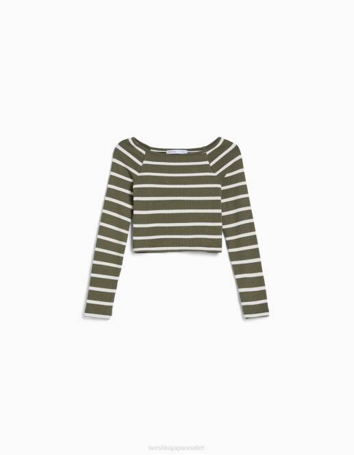 女性 Bershka ボートネックのストライプ長袖Tシャツ 6044517 衣類 カーキ