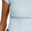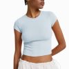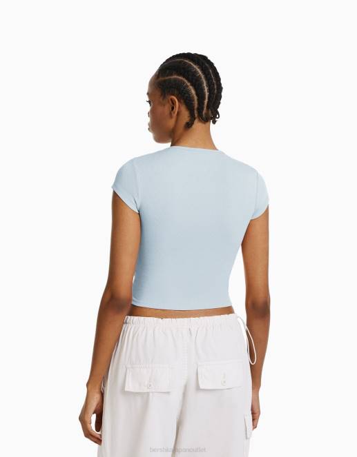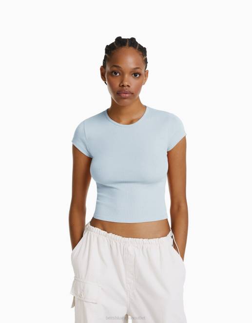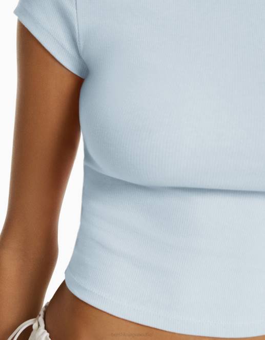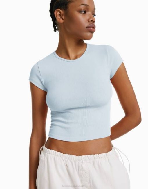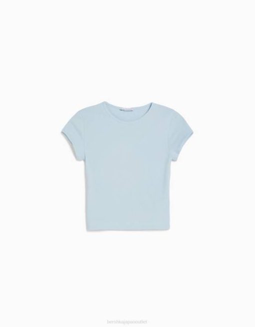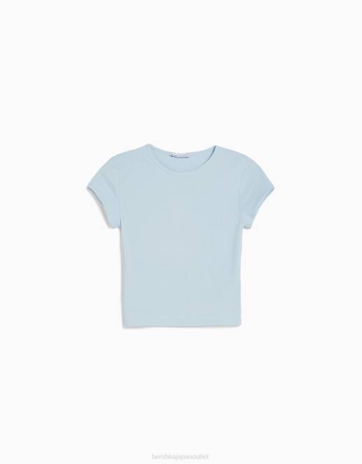 女性 Bershka リブ半袖Tシャツ 6044348 衣類 ライトブルー