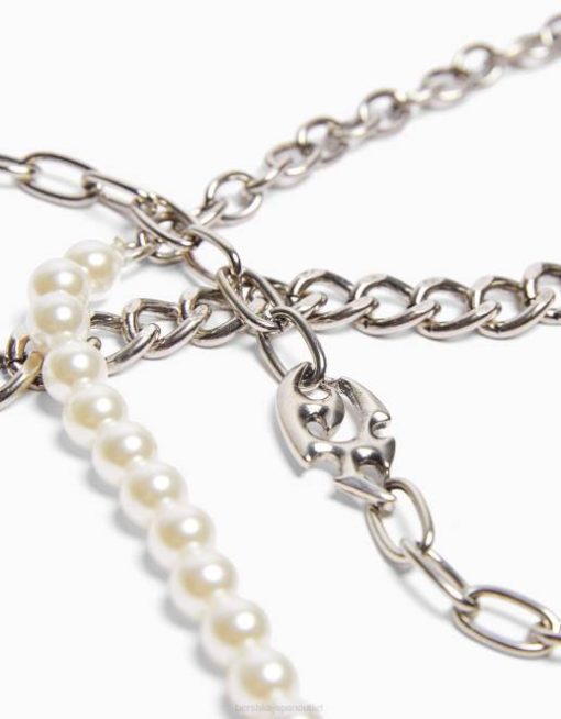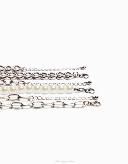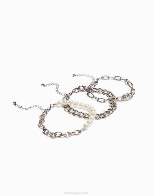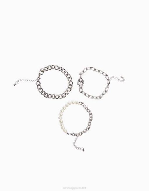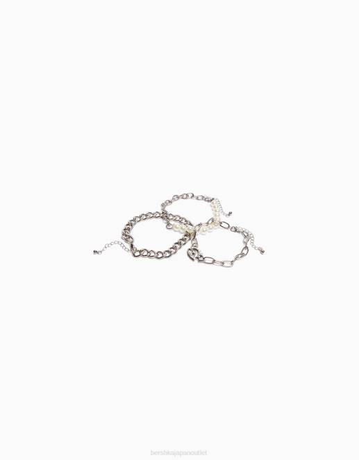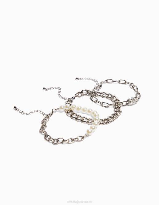 男性 Bershka パールビーズチェーンブレスレット3個パック 60443648 アクセサリー 銀